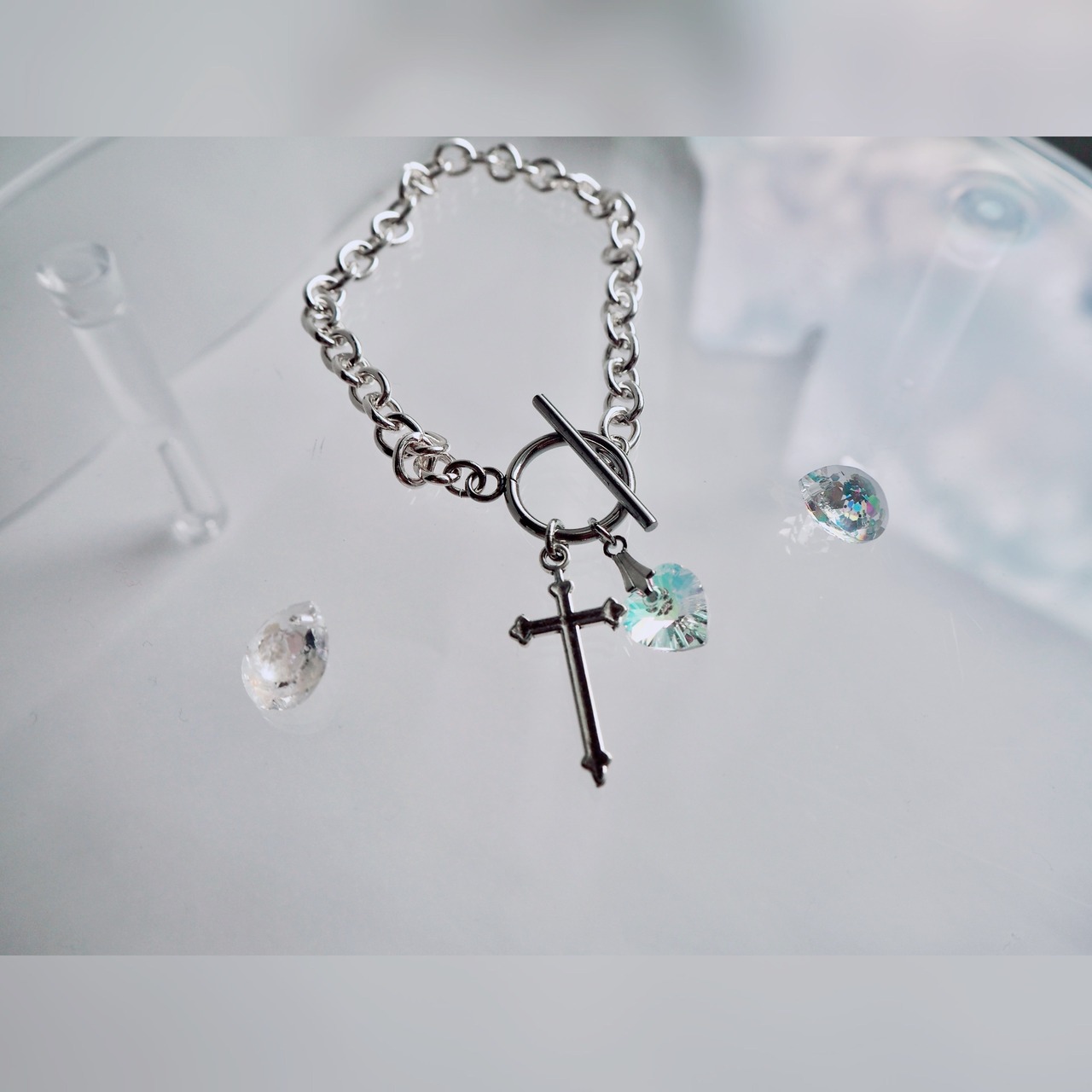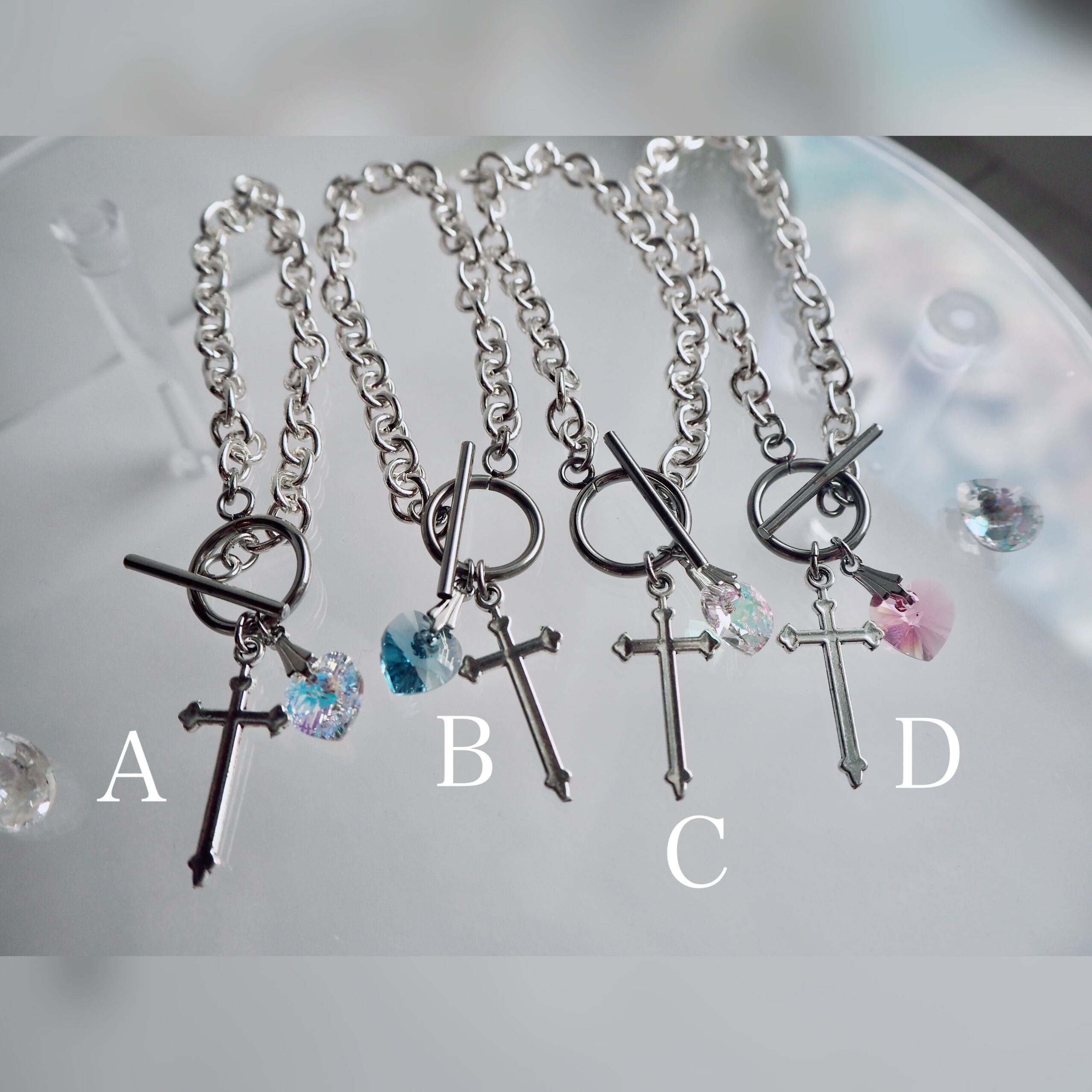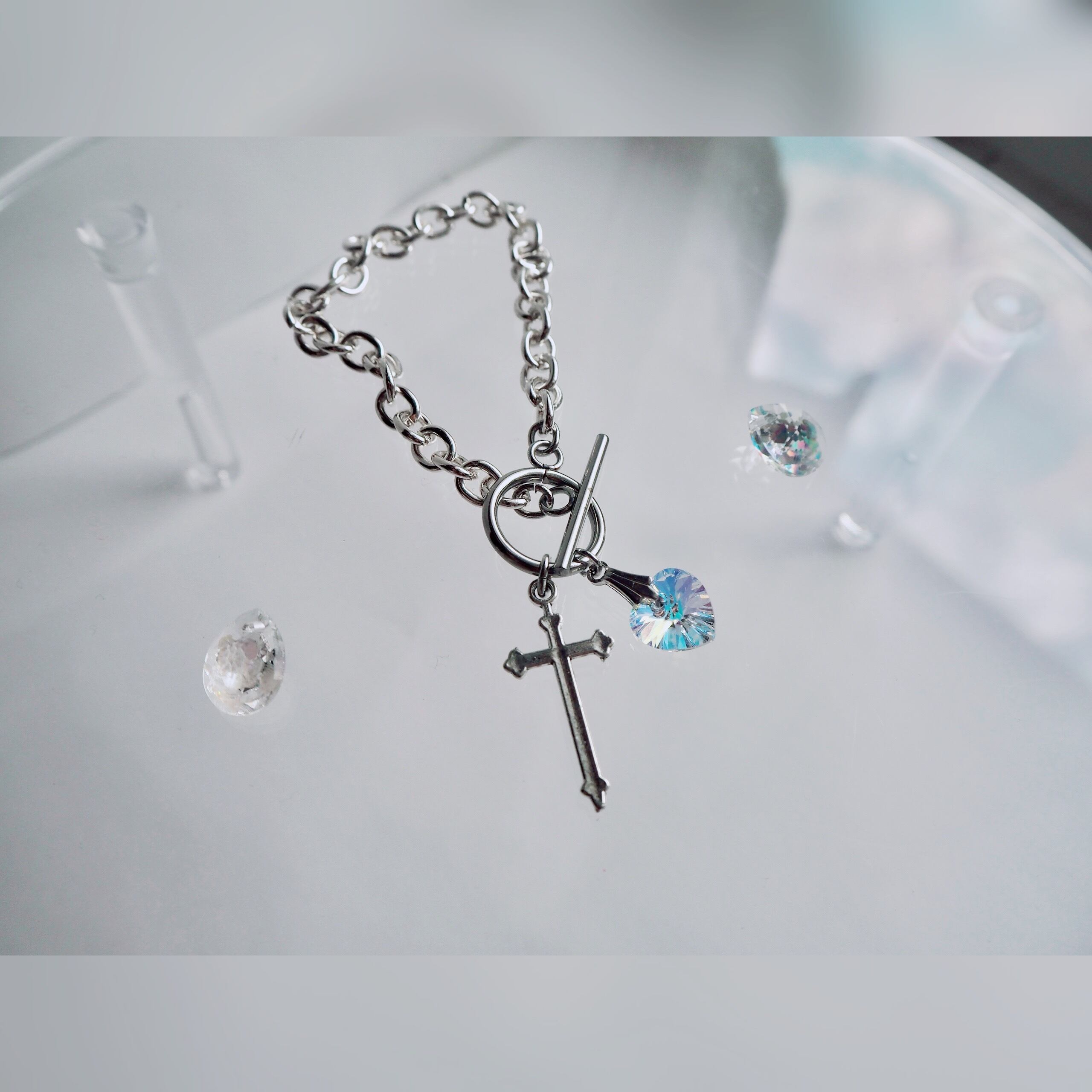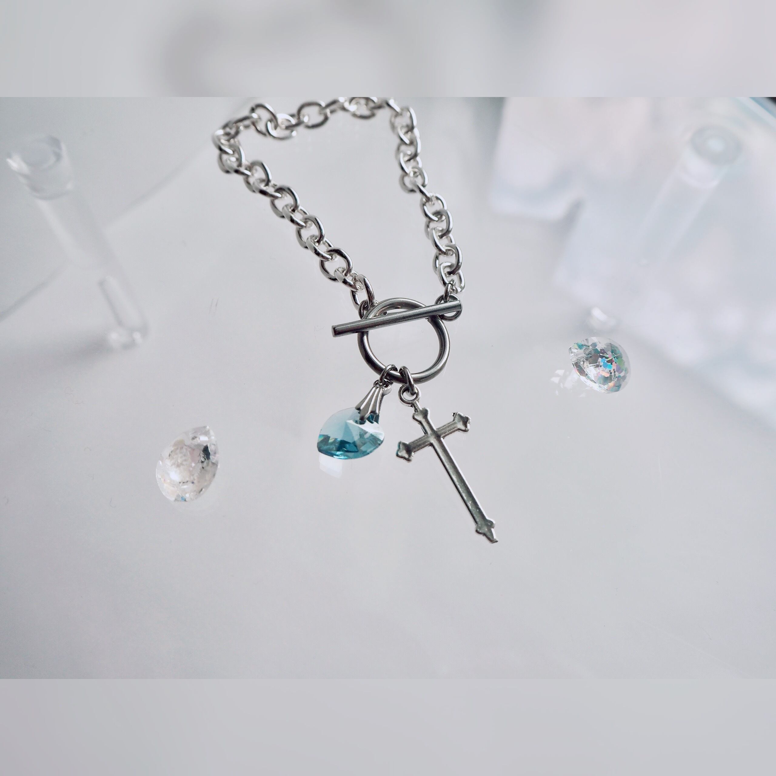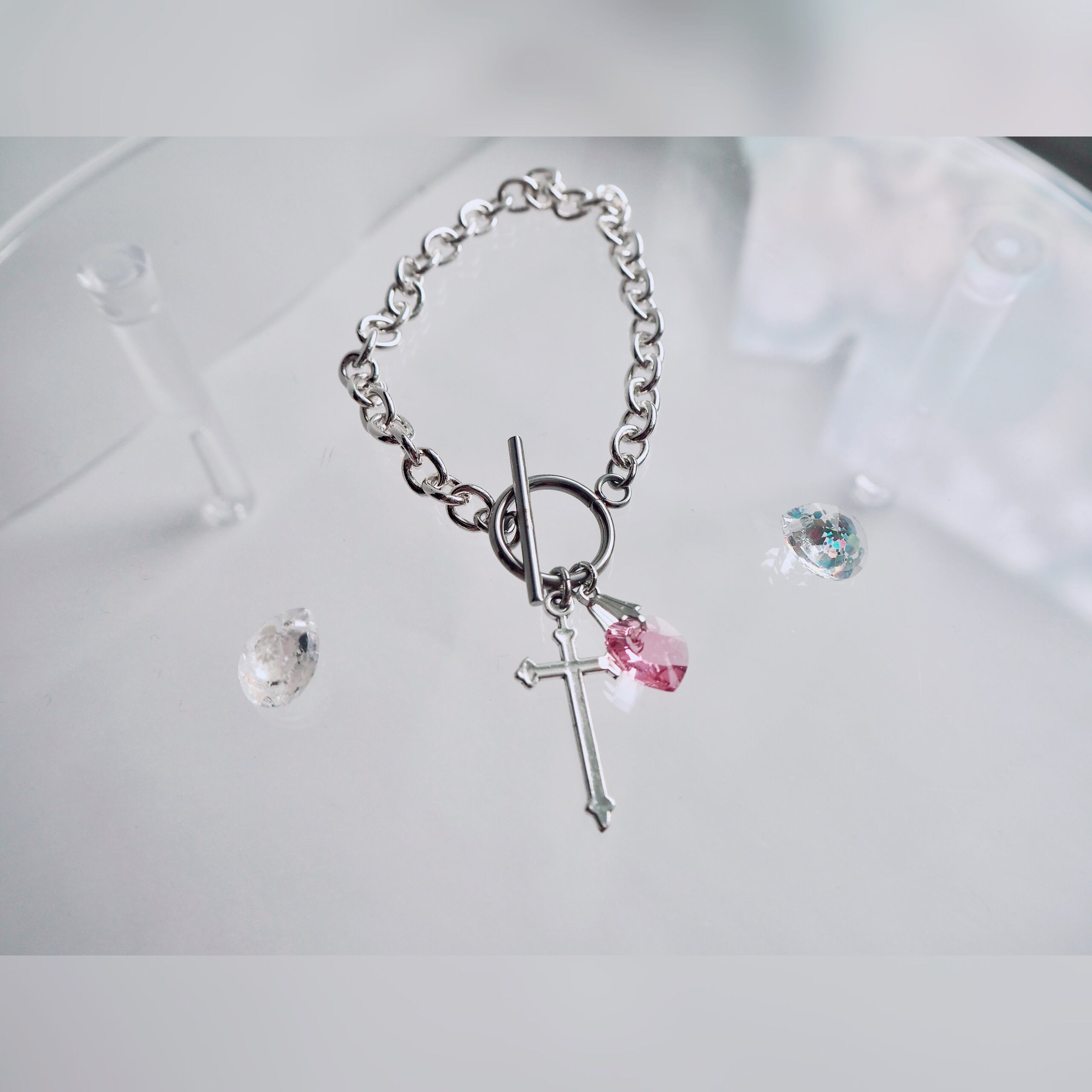 クリスタル 十字架 淡色 ブルー 青 ピンク 透明星 メンズ ギフト プレゼント オリジナル ブレスレット 人気 クロス チェーン 地雷